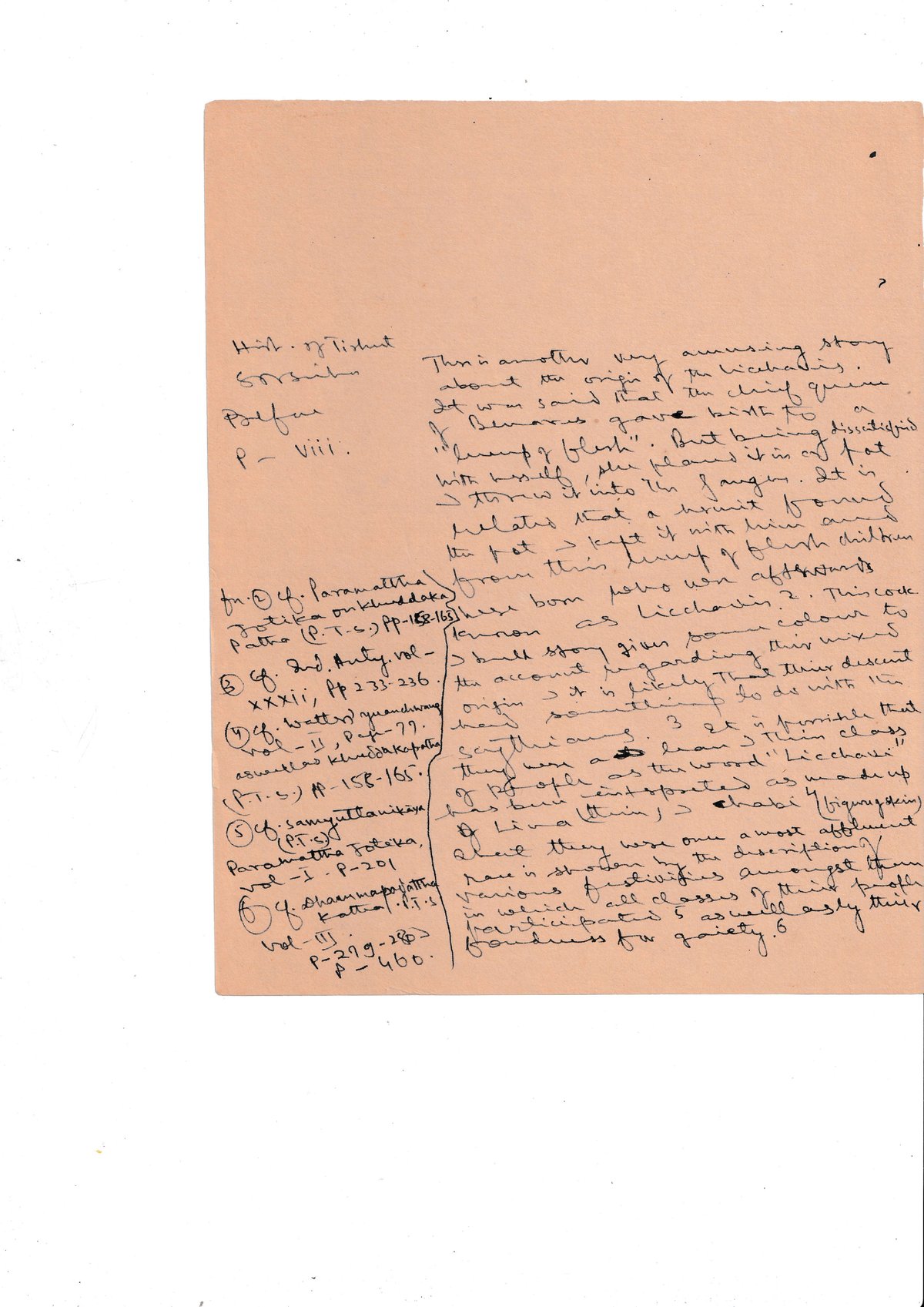 This is another very amusing story about the origin of the Licchavis. It was said that the chief queen of Benares gave birth to a "lump of flesh". But being dissatisfied with herself, she placed it in a pot → threw it into the Ganges. It is related that a hermit found the pot → kept it with him and from this lump of flesh children sprang up, known as Licchavis(?). This cock & bull story gives some colour to the account regarding their descent from(?) & of Paramattika Jotika on Khuddaka Patha (P.T.S.) Pp-158-165.
