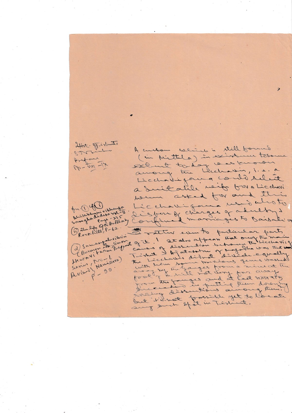 3 other customs particular parts. 1. It also appears that any(?) main cause of dissection between the Lichavis and Ajatasatru of magadha was that the Licchvis did not divide equally with him some provisions gems(?) washed ashore by the Ganges from a mine at the foot(?) the hill not very far away from the ganges and at last got in(?) placing them down saying dissections among them. But it is not possible yet to locate any such spot in Vaisali.