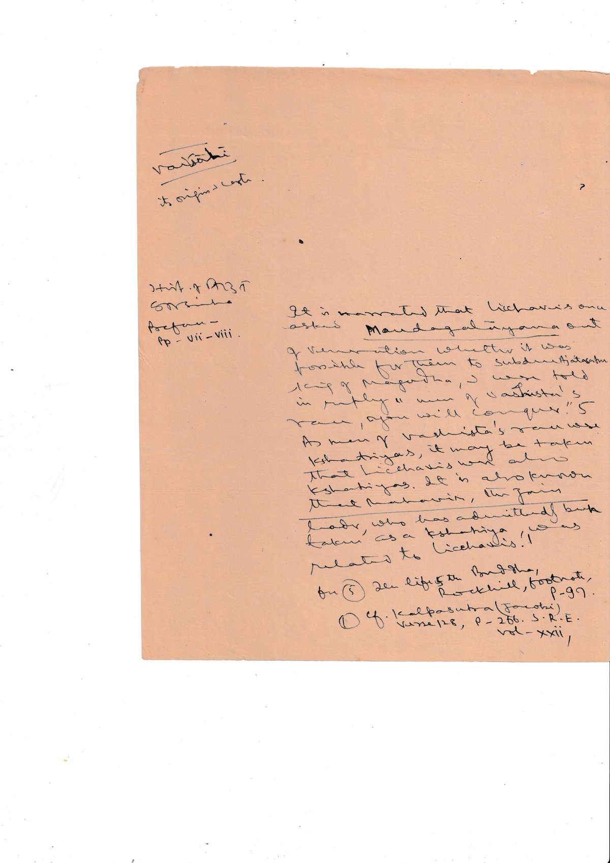 It is narrated that Lichavis once asked Mandagal ayana out(?) of Udumbara, whether it was possible for them to subdue Ajatasatru, King of Magatha, when told in reply "men of "asbista's" race, ayon will conquer" 5 As many vashista's race were Kshatriyas, it may be taken that Licchavis were also kshatriyas. It is also known that Mahavir, the Jain head, who has admitted both taken as a Kshatriya, was related to Licchavis.
