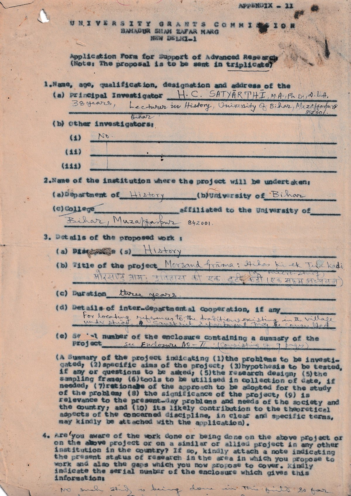 (a) Principal Investigator H. C. SATYARTHI, M.A., Ph.D., A.I.H., 38 years, Lecturer in History, University of Bihar, Muzaffarpur Bihar