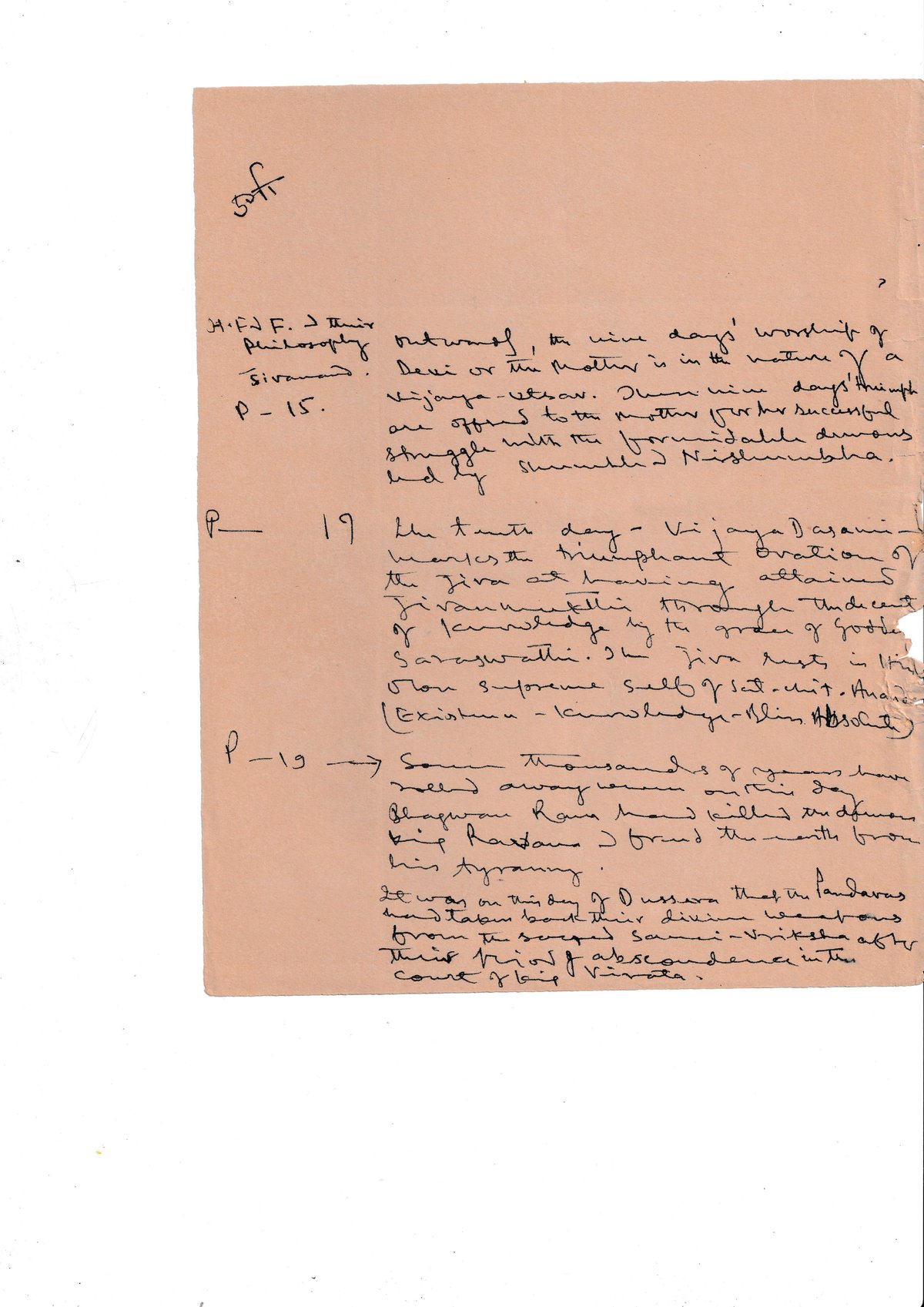 H.E.J.F. J Thir philosophy outward, the nine days' worship of sivanand. Devi or the Mother is in the nature of a Vijaya-utsav. During nine days' this wife P - 15. are offered to the mother for her successful struggle with the formidable demons had by Sumbha & Nishumbha.