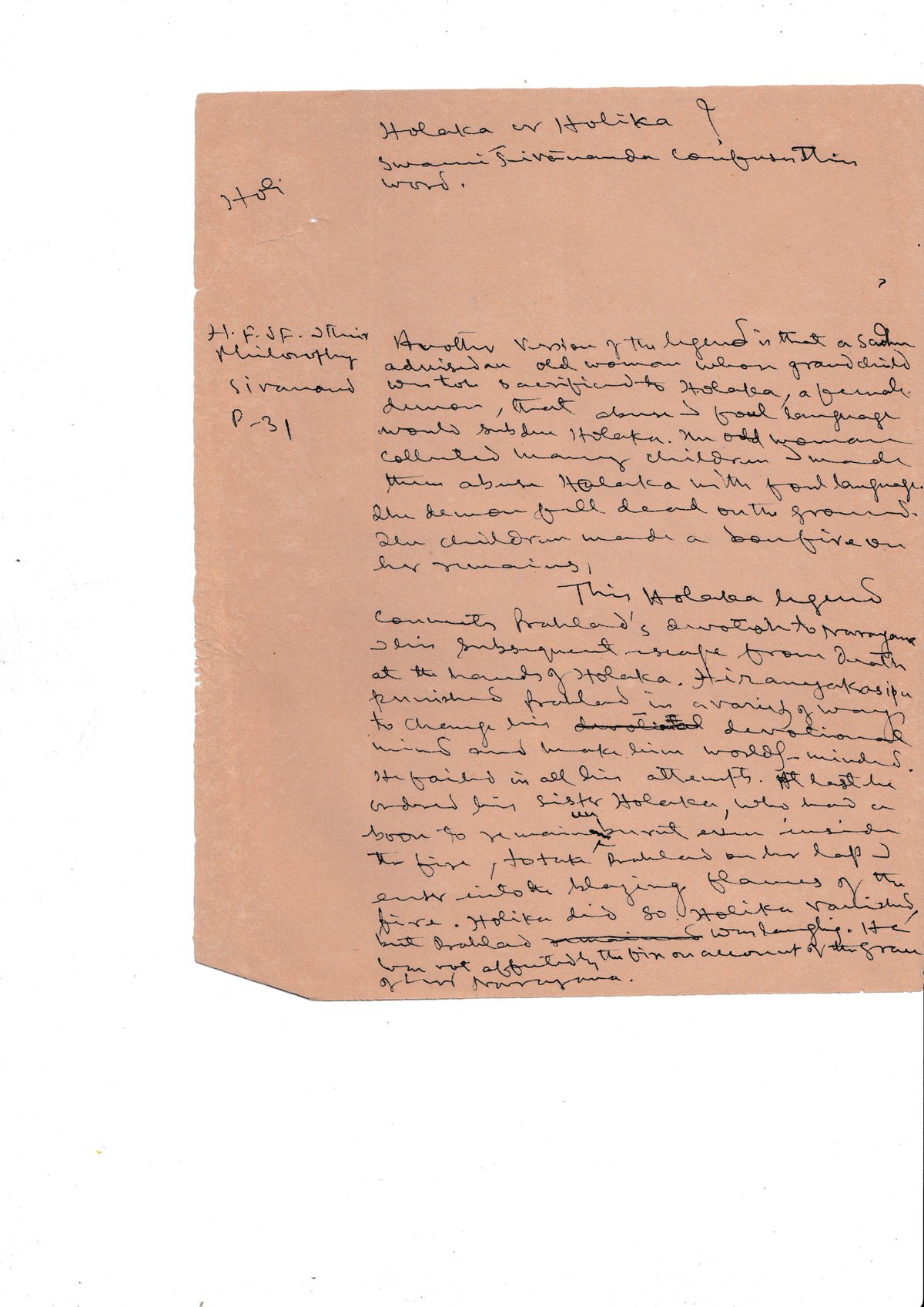 H.F.S.P. This Another version of the legend is that a Sadhu Philosophy advised an old woman whose grandchild Sivanand was to be sacrificed to Holaka, a female P-31 demon, that abuse of foul language would subdue Holaka. The old woman collected many children & made them abuse Holaka with foul language. The demon fell dead on the ground. The children made a bonfire on her remains.