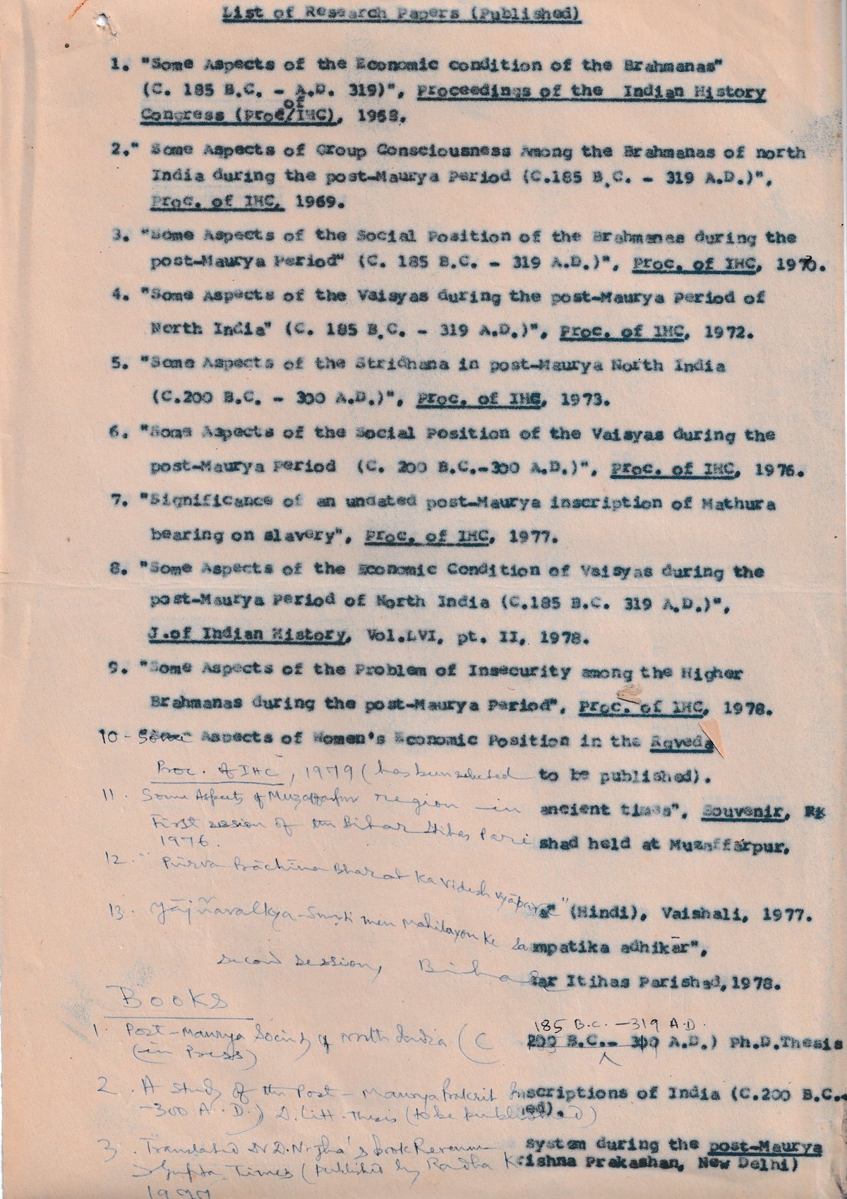 1. "Some Aspects of the Economic condition of the Brahmanas" (C. 185 B.C. - A.D. 319)", Proceedings of the Indian History Congress (Proc/IHC), 1958.