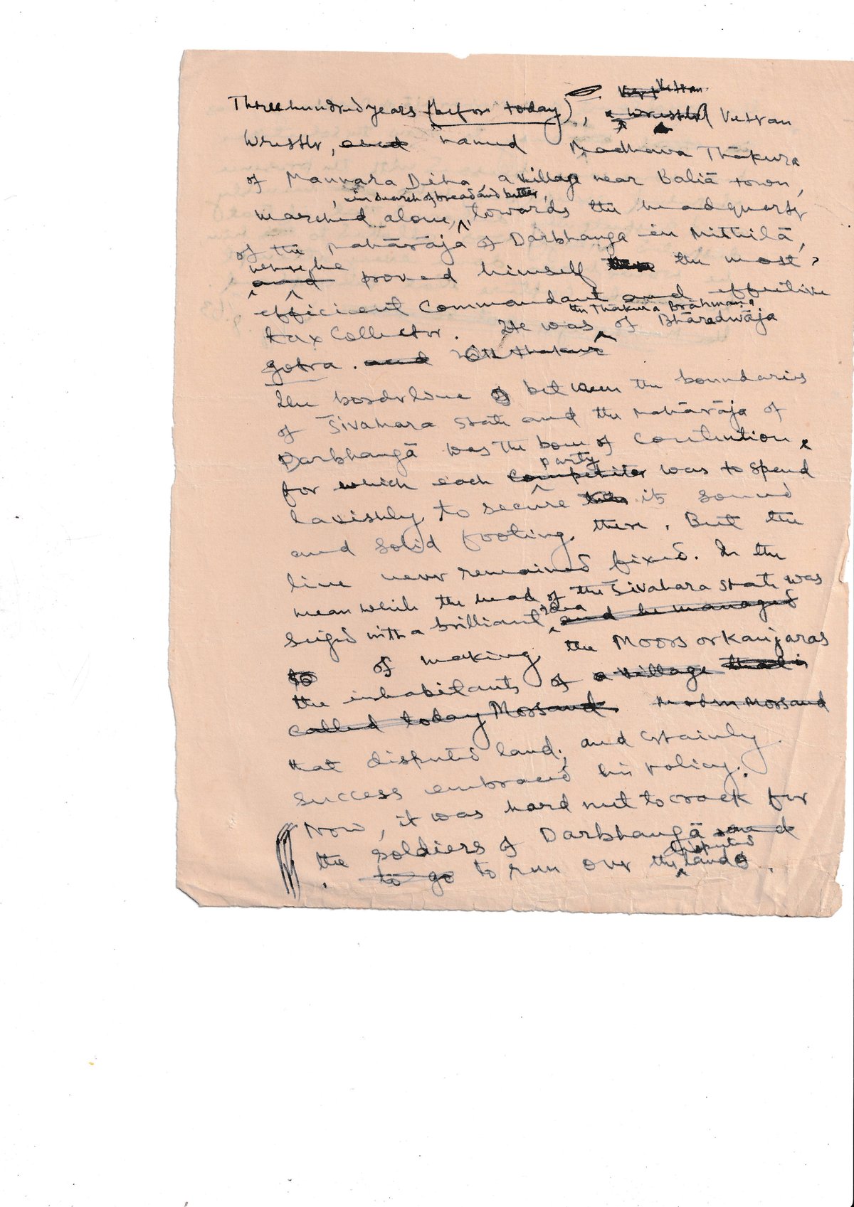 Three hundred years before today, a successful Vetran Warth(?) named Madhava Thakura of Mannara Dikha, a village near Balia town, marched alone towards the headquarters of the Maharaja of Darbhanga in Mithila, where he proved himself the most efficient Commandant cum Taxcollector. Kax Collector. He was of Bharadwaja gotra, and Brahman.