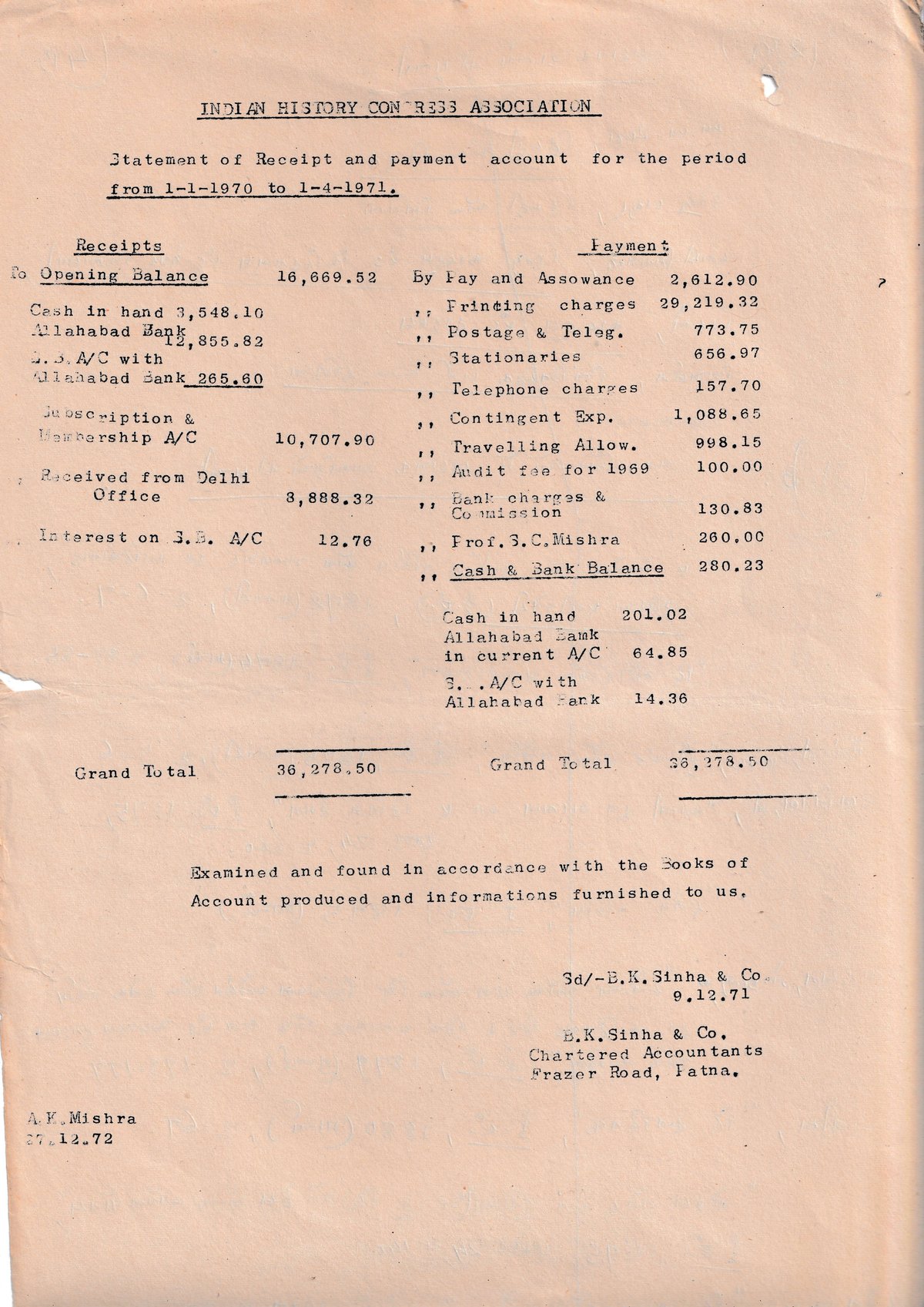 Statement of Receipt and payment account for the period from 1-1-1970 to 1-4-1971.
