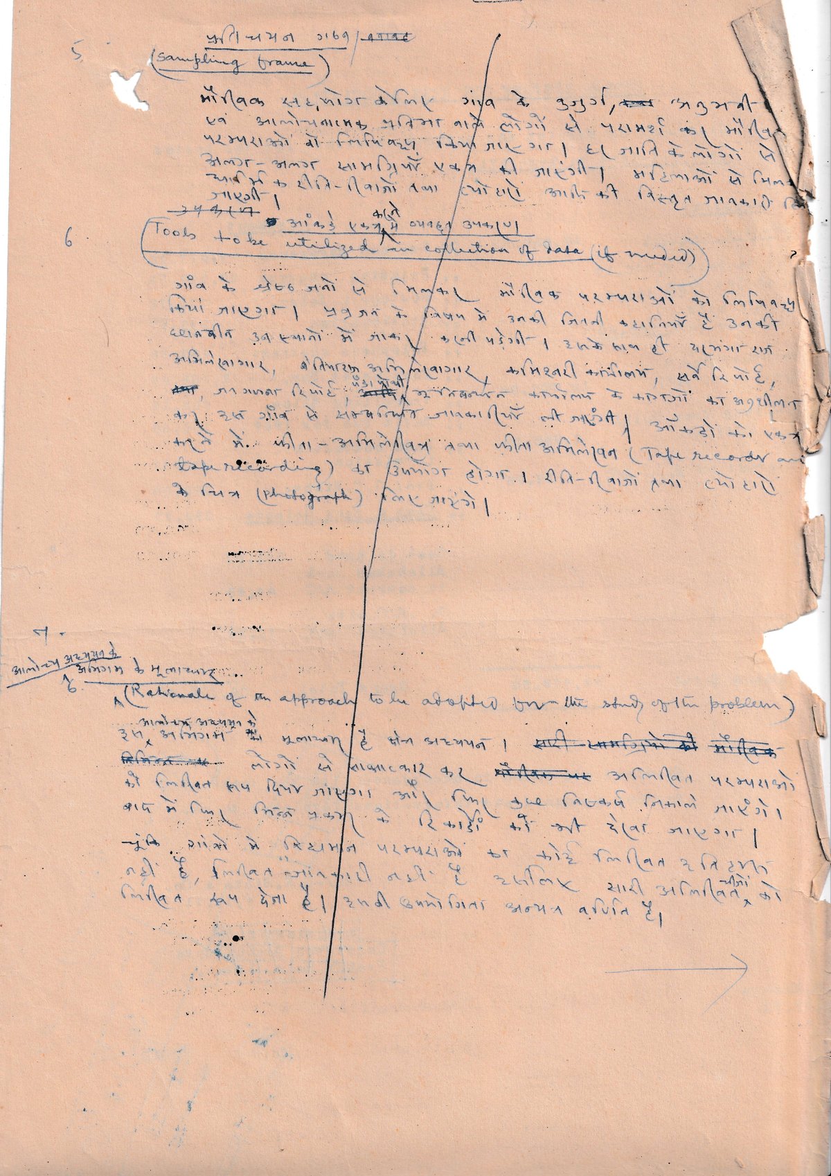 आंकड़े एकत्र करने में निम्न उपकरण काम में लाए जाएंगे: गांव के श्रेष्ठ जनों से मिलकर मौखिक परम्पराओं को लिपिबद्ध किया जाएगा। प्रव्रजन के विषय में उनकी जितनी भी कहानियां हैं उनकी रिपोर्ट तैयार करनी पड़ेगी। उसके साथ ही दरभंगा राज अभिलेखागार, बेतिया अभिलेखागार, जनगणना रिपोर्ट, भू-राजस्व कार्यालय के कारणों का अनुशीलन किया जाएगा। इस गांव से सम्बन्धित जानकारियों को जाना जाएगा। आंकड़ों को दर्ज करने हेतु टेप-रिकार्डर तथा फीता-अभिलेखीय तथा फीता अभिलेखन (Tape recorder tape recording) का उपयोग होगा। रीति-रिवाजों तथा त्योहारों के चित्र (photograph) लिए जाएंगे। The following tools will be used in collecting data: Oral traditions will be documented by meeting with the distinguished people of the village. Reports will have to be prepared of all their stories about migration. Along with this, examination will be done of the reasons from Darbhanga Raj Archives, Betiya Archives, census reports, land revenue office. Information related to this village will be known. For recording data, tape recorder and tape recording will be used. Pictures (photographs) of customs and festivals will be taken.
