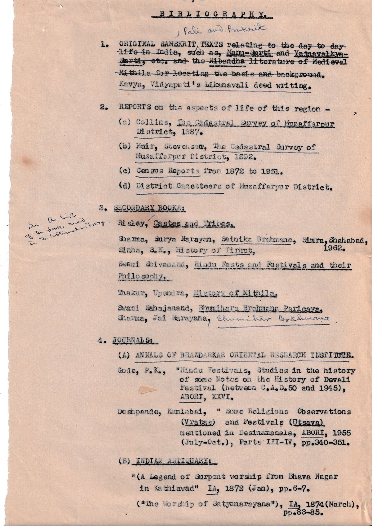 1. ORIGINAL SAMSKRIT TEXTS relating to the day to day life in India, such as, Manu-Smrti and Yajnavalkya-Smrti, etc. and the Nibandha literature of Medieval Mithila for locating the basis and background. Kavya, Vidyapati's Likaravali deed writing.