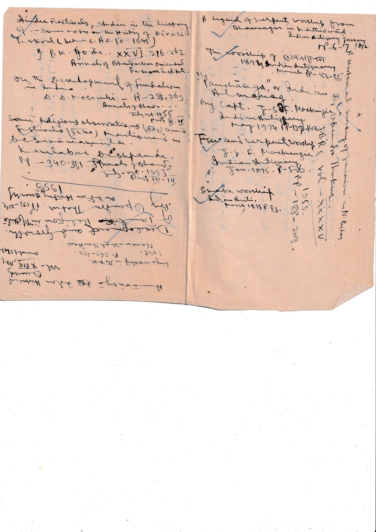 On the development of feudalism in India. D. D. Kosambi - A-258.265. Annals of Bhav. - July 1955 Some Religious observations (AA) and Festivals (31+8a) mentioned in Desikamangala. Kamalabai Deshpande. 11 - 340-351. Annals of Bhanja July. oct. 153 Part III-10
