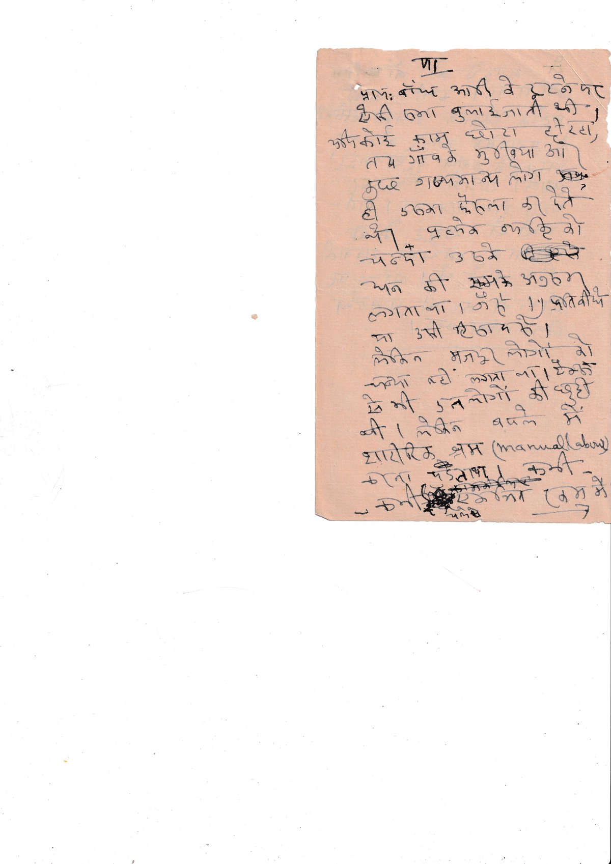 पा- प्राय: बाँध आदि के टूटने पर उसकी जेमा बुलाई जाती थी। अधिकांश काम छोटा सा हो तब गाँव के मुखिया और कुछ गण्यमान्य लोग प्रयः ही उसका फैसला कर देते थे। प्रत्येक परिवार को चन्दा उठाने के अन की प्रमात्र अनुसार लगता था। जैसे 1" प्रतिबीघे मा उसी हिसाब से। लेकिन मजदूर लोगों को कम्या(?) नहीं लगता था टैक्स(?) से भी उन लोगों की छुट्टी थी। लेकिन बदले में शारीरिक श्रम (manual labour) करना पड़ता था। कभी दिगमित(?) में